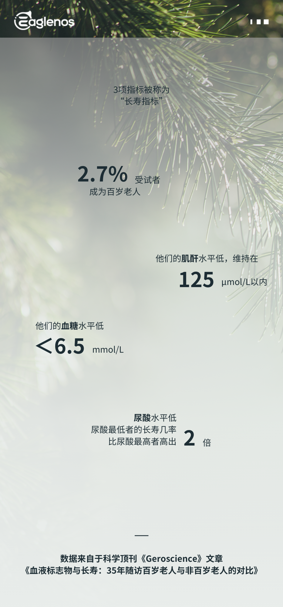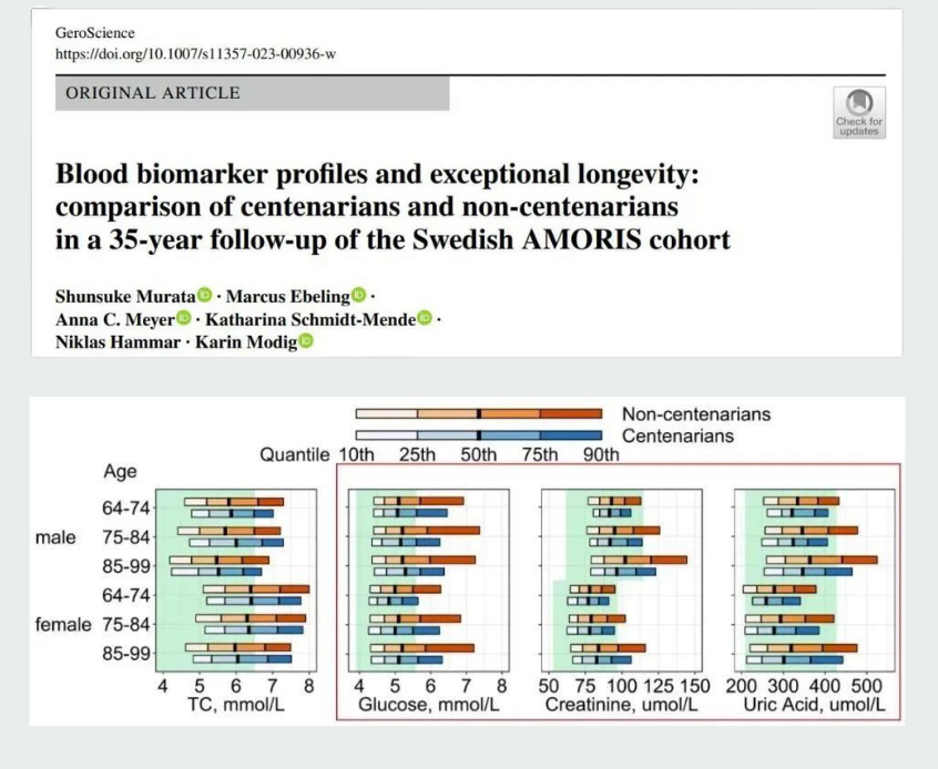 百岁老人和非百岁老人差异较大的三种生物标志物是血糖、肌酐和尿酸,这三种标志物水平在百岁老人测量的各个年龄段都明显低于同龄非百岁老人,而这些指标恰恰是“低一点好”。