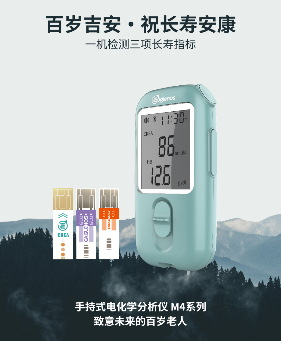 平博pinnacle平台科技手持式电化学分析仪M4系列,可居家完成三大长寿指标检测。其所用的肌酐检测试纸为平博pinnacle平台创新肾病管理产品,填补了居家肾病管理的市场空白,让更多注重健康的人能随时随地了解自己的身体状况、做好健康管理。